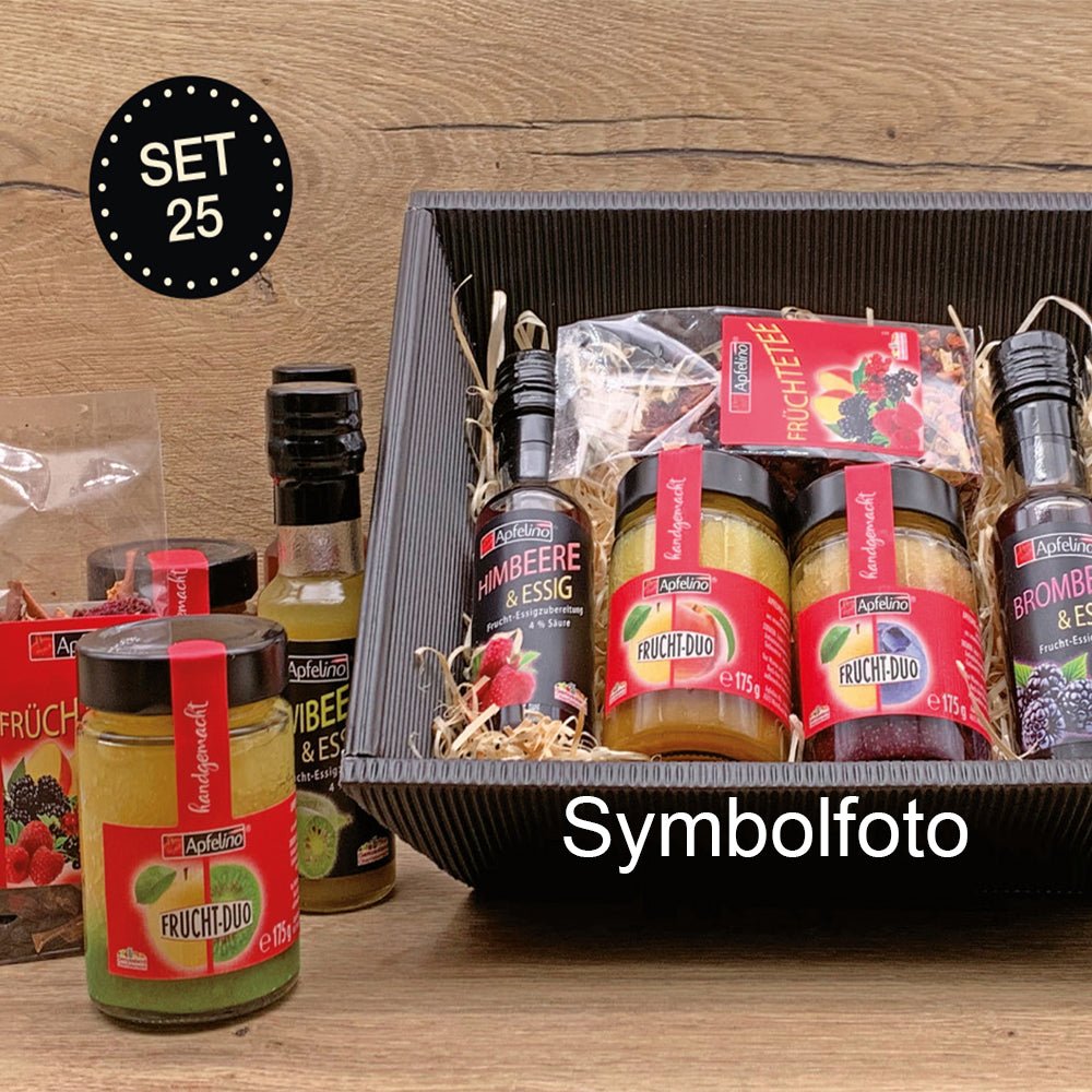 Inhalt: Apfelino Frucht-Essigzubereitung Himbeere & Essig 0,10 l, Apfelino Frucht-Duo Äpfel mit Pfirsichen 175 g, Apfelino Frucht-Duo Äpfel mit Heidelbeeren 175 g, Apfelino Frucht-Essigzubereitung Brombeere & Essig 0,10 l, Apfelino Früchtetee 50 g, in Geschenksschale mit durchsichtiger Hülle, Holzwolle, Anhänger "handmade".