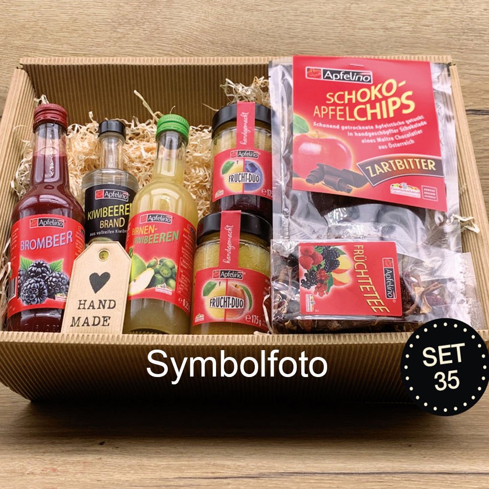 Inhalt: Apfelino Brombeernektar 0,25 l, Apfelino Kiwibeerenbrand 0,10 l, Apfelino Birnen-Kiwibeerensaft 0,25 l oder Birnensaft 0,25 l (je nach Verfügbarkeit), Apfelino Früchtetee 50 g, Apfelino Schoko-Apfelchips Zartbitter 100 g, Apfelino Schoko-Heidelbeeren im Glas 60g, Geschenksschale mit durchsichtiger Hülle, Holzwolle, Anhänger "handmade"